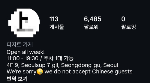 '중국인 안 받는다' 문구 게시한 성동구 성수동 카페 인스타그램 게시물