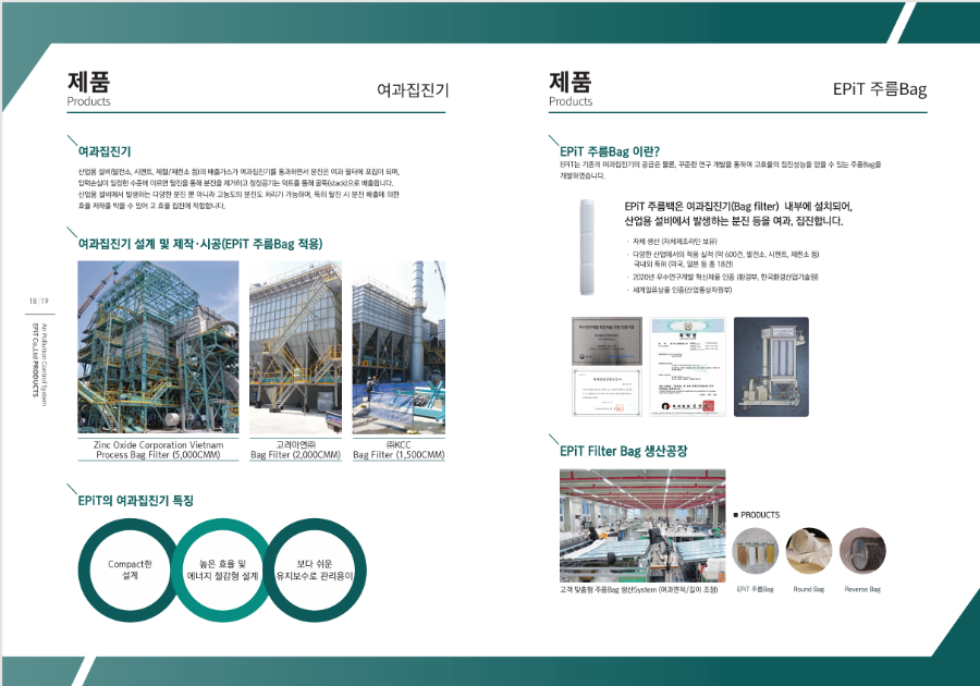산업용 설비(발전소, 시멘트, 제철/제련소 등)의 배출가스가 여과집진기를 통과하면서 분진은 여과 필터에 포집이 되며, 압력손실이 일정한 수준에 이르면 탈진을 통해 분진을 제거하고 청정공기는 덕트를 통해 굴뚝(stack)으로 배출됩니다. 산업용 설비에서 발생하는 다양한 분진 뿐 아니라 고농도의 분진도 처리가 가능하며, 특히 탈진 시 분진 배출에 의한 효율 저하를 막을 수 있어 고효율 집진에 적합합니다.