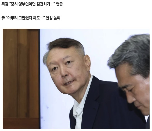 특검팀이 “당시 영부인이던 김건희”라고 호칭한 데 대해 윤 전 대통령은 “아무리 (대통령직을) 그만두고 나왔다고 해도 김건희가 뭡니까. 뒤에 여사를 붙이든지 해야지”라며 언성을 높였다.