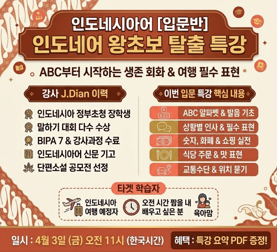 이번 기회를 통해 내 실력에 딱 맞는 레벨에서 인도네시아어 실력을 한 단계 업그레이드해 보세요. 특강에서 뵙겠습니다! 감사합니다.
