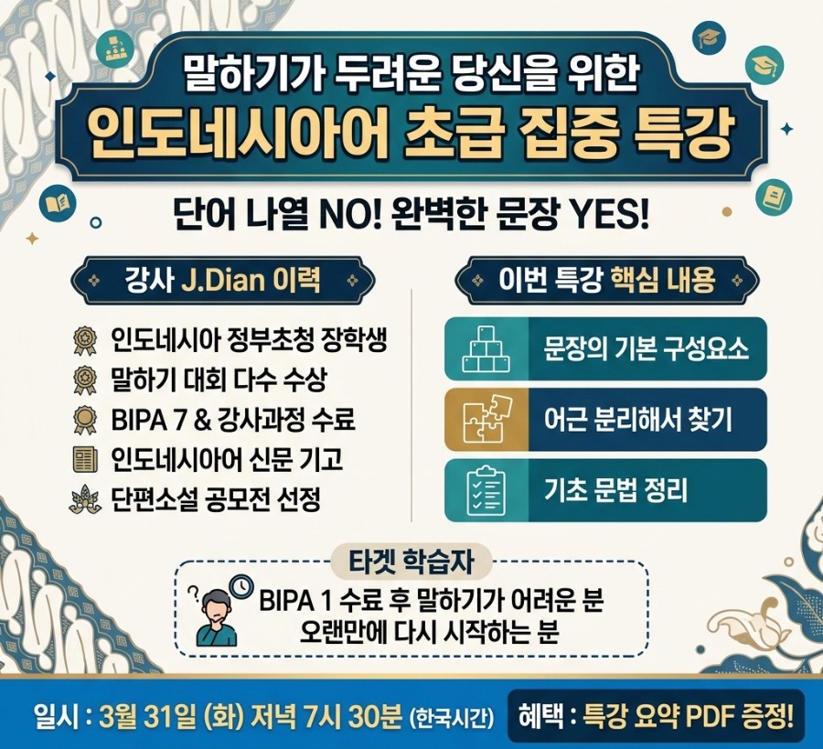 이번 기회를 통해 내 실력에 딱 맞는 레벨에서 인도네시아어 실력을 한 단계 업그레이드해 보세요. 특강에서 뵙겠습니다! 감사합니다.
